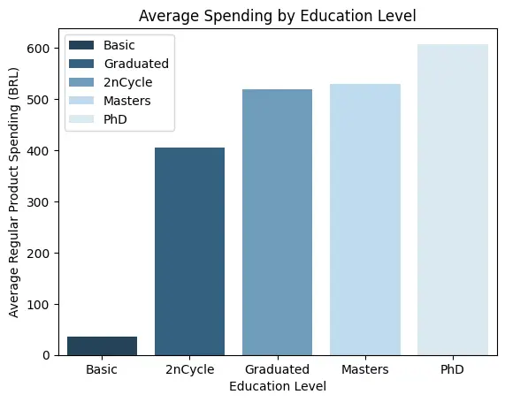 Customers with a PhD spent an average of 608 R$ on regular products, exceeding the overall sample average by 90 R$. Additionally, spending varies substantially across education categories, with a total range of 572 R$.