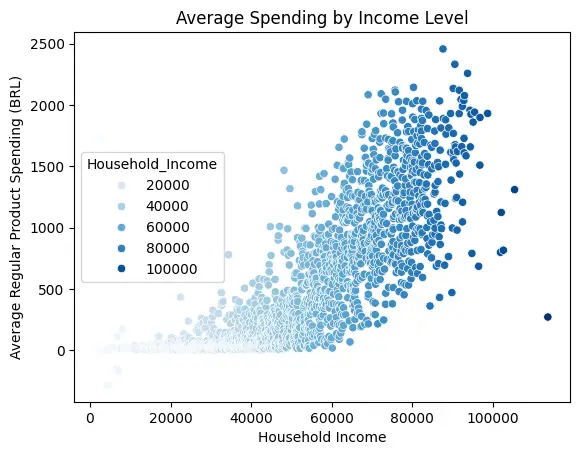 For every 1 R$ increase in income, average regular product spending increases by 0.03 R$. Income explains approximately 67% of the variance in spending, confirming a strong relationship between purchasing power and customer value.